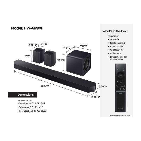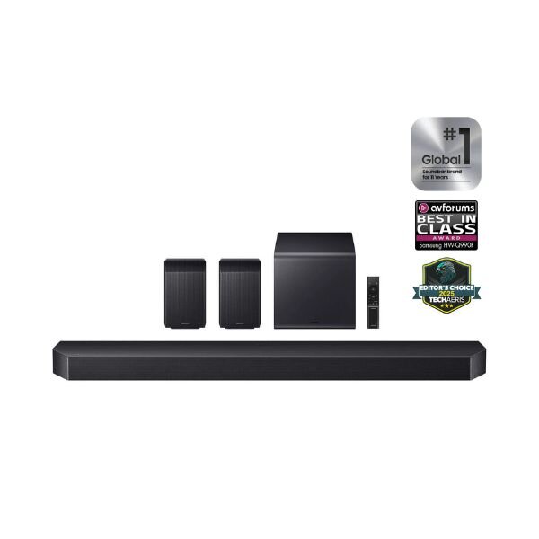 Experience cinematic surround sound at home with the Samsung HW-Q990F 11.1.4-Channel Dolby Atmos Soundbar System.