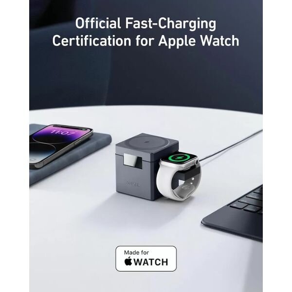 The ANKER 3-in-1 Cube with MagSafe is a sleek and convenient wireless charging station designed to keep all your Apple devices powered up at once. This compact cube supports fast charging for your iPhone, Apple Watch, and AirPods, all in one place. Its MagSafe compatibility ensures optimal charging alignment, while its modern design complements any workspace or bedside table.