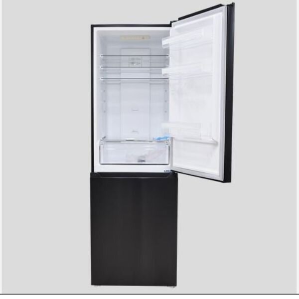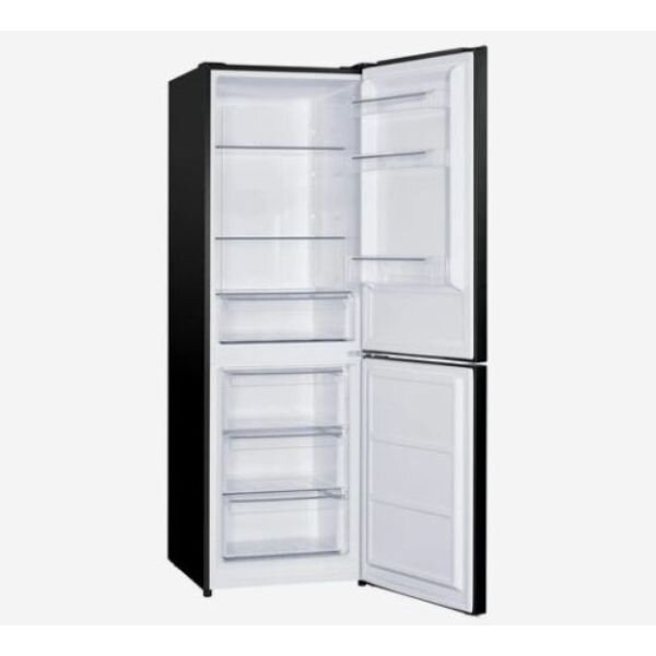 -Design and Finish: Sleek Black Inox with bottom freezer layout